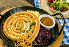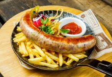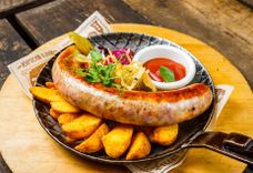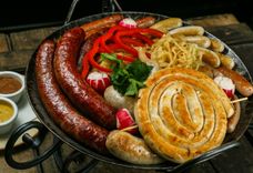 1500/600/250 г • Ассорти из фирменных колбасок собственного приготовление: Венская куриная улитка с сыром, Нюрнбергские сосиски, копчёная Казекрайнер, Вацлавская и охотничьи, подаётся с гарниром из жареного картофеля с розмарином, и тушеной белой и красной квашеной капусты. Дегустируйте колбаски с сладкой Баварской и острой Дижонской горчицей.