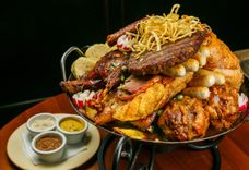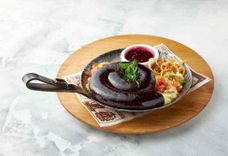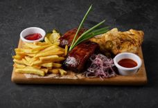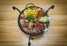 2080/1100/380 г • Фирменное блюдо нашего ресторана! Огромное мясное блюдо для настоящей дружной компании на любой вкус: копчёная колбаса Казекрайнер, свиные рёбра копчёно-запечённые в Техасском смокере, рубленный сербский стейк - Плескавица, Нюрнбергские сосиски и шашлык по-кавказки из свиной шей. Подаётся на большой сковороде с тушёной белой и красной квашеной капустой, жареным картофелем с розмарином и фирменным пивным соусом, сладкой Баварской, острой Дижонской горчицей и хреном.