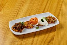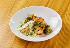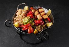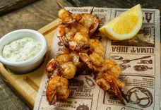 400/500/800/100 г • Сытная пивная закуска: шашлычки из креветок, лосося с сладким перцем и лимоном, в сопровождении овощей гриль - баклажан, цукини и перец, подаётся на большой сковороде с подогревом. Рекомендуем заказать классический соус Тар Тар - это правильный соус к шашлычкам.