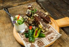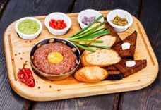 200/270 г • Фирменная закуска из сырой рубленой говядины, заправляется коньяком, желтком, горчицей, луком и ароматными специям, подаётся с каперсами и гренками из нашего свежевыпеченного хлеба.