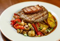 260/100/120 г • Ароматный стейк из говяжьей вырезки, степени прожарки Medium, под винным соусом с белыми грибами и овощами гриль.