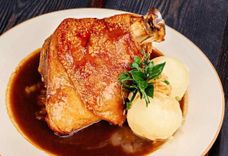 230/150/100 г • Запечённая свиная рулька по-старинному баварскому рецепту с хрустящей корочкой. Подаётся с гарниром из тушёной белой квашеной капусты, баварскими картофельными кнодлями и фирменным пивным соусом.