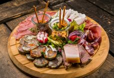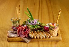 1020 г • Большая закуска из мясных деликатесов: домашний сальтисон и сало, сыровяленная колбаса, свиной балык и венгерский сервелат, подаётся с сырным паштетом обацда, корнишонами, свежим редисом, хреном и острым маринованным перцем пири пири.