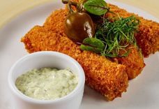 100/150/80 г • Шницель из семги и тунца в панировке, подается с отварными рисом и нежным сливочным соусом.