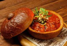 350/260 г • Густой и сытный томатный суп-гуляш из оленины с овощами, подаётся в хлебной «чаше».