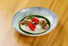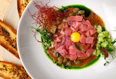 160/120/75 г • Закуска из сырого красного тунца, приправленная устричной заправкой, перепелиным желтком и каперсами. Подаётся с хрустящими гренками из багета с итальянским маслом.