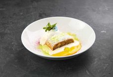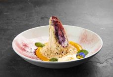 125/45 г • Рулет из хрустящей меренги с фисташками, нежным сливочном кремом с черникой подаётся с венским соусом и морковным маслом.