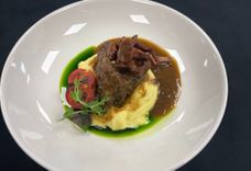 310 г • Сытное жаркое с овощным соусом и картофельным пюре.