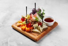 480/50 г • Ассорти закусок: мясной деликатес - окорок Прошутто крудо с оливками и большими каперсами, сыры - с благородной плесенью и Пармезан с виноградом, хрустящие гренки с ароматными травами в сопровождении мягкого домашнего сырного мусса.