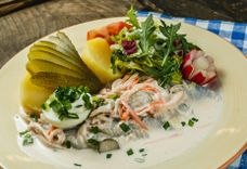 290 г • Слабосоленая сельдь с луком, маринованным и зелёным подаётся с отварным картофелем, под сливочным маслом с укропом